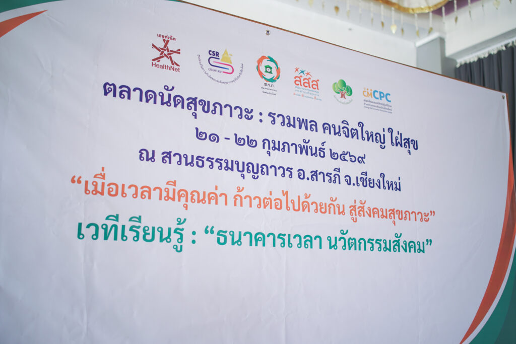เมื่อวันเสาร์อาทิตย์ 21 ถึง 22 นี้ กุมภาพันธ์ 2569 ณ สวนธรรมบุญถาวร อำเภอสารภี จังหวัดเชียงใหม่ ได้จัดกิจกรรม ตลาดนัดสุขภาวะ รวมพล คนจิตใหญ่ ใฝ่สุข โดยสำนักงานกองทุนสนับสนุนการเสริมสร้างสุขภาพ (สสส.) ภายใต้โครงการพัฒนาธนาคารเวลากลาง